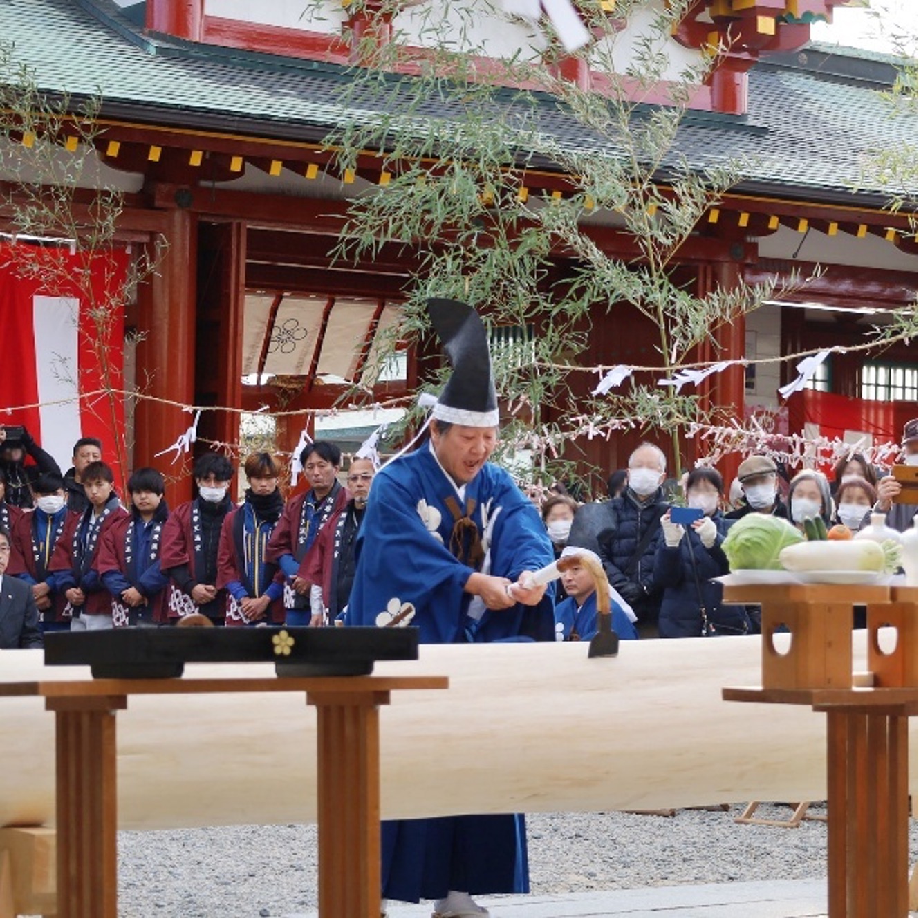 1月5日に防府天満宮で行われた 建築工事の安全を願う仕事始めの神事「釿始式(ちょうのはじめしき)」にて 社長の藤本が棟梁役を務めました。 毎年棟梁役を務めさせていただき、気持ちもより引き締まります。 |