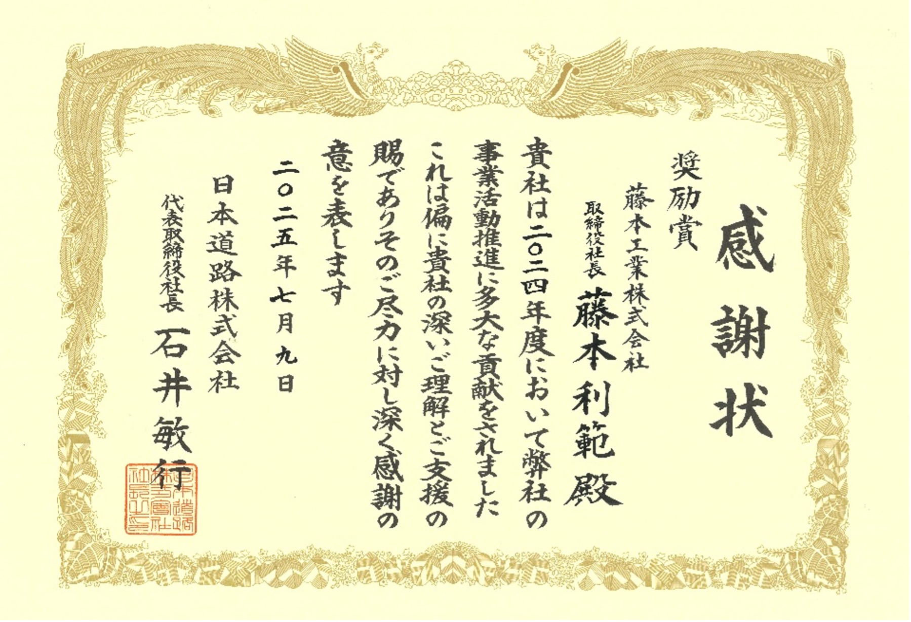 2024年度において日本道路株式会社様の事業活動推進に貢献したとして感謝状を頂きました。